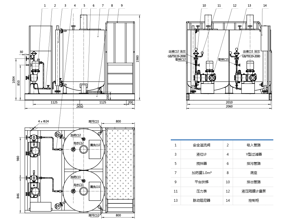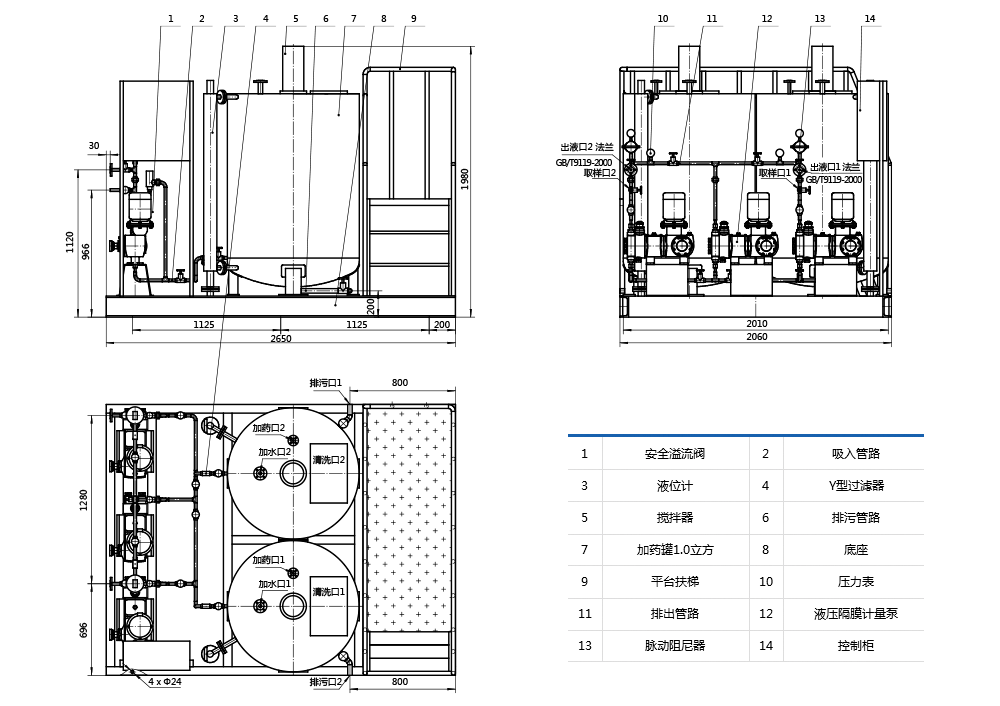 裝置具有結(jié)構(gòu)緊湊,體積小,耐腐蝕,耗能低,操作維護(hù)方便。有儲存藥劑,混合和外輸?shù)墓δ堋?/span>